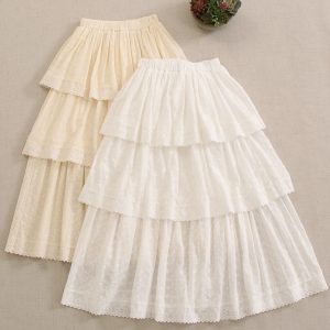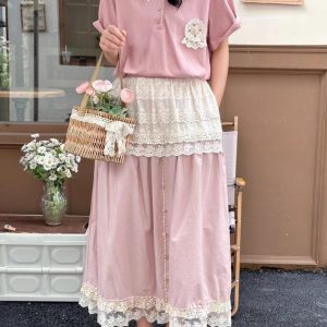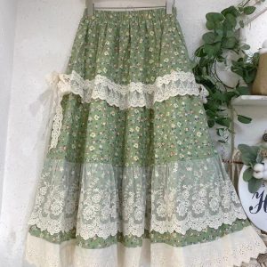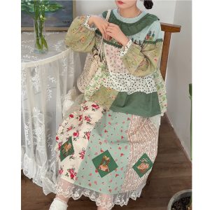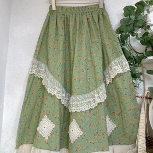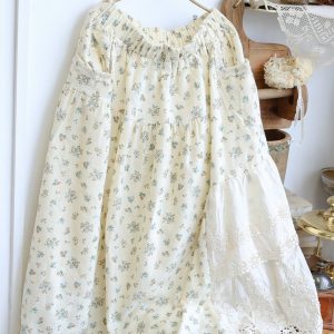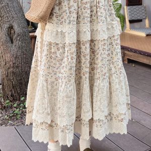 Beigecottoncardigan Floral Skirt With Lace Trim
