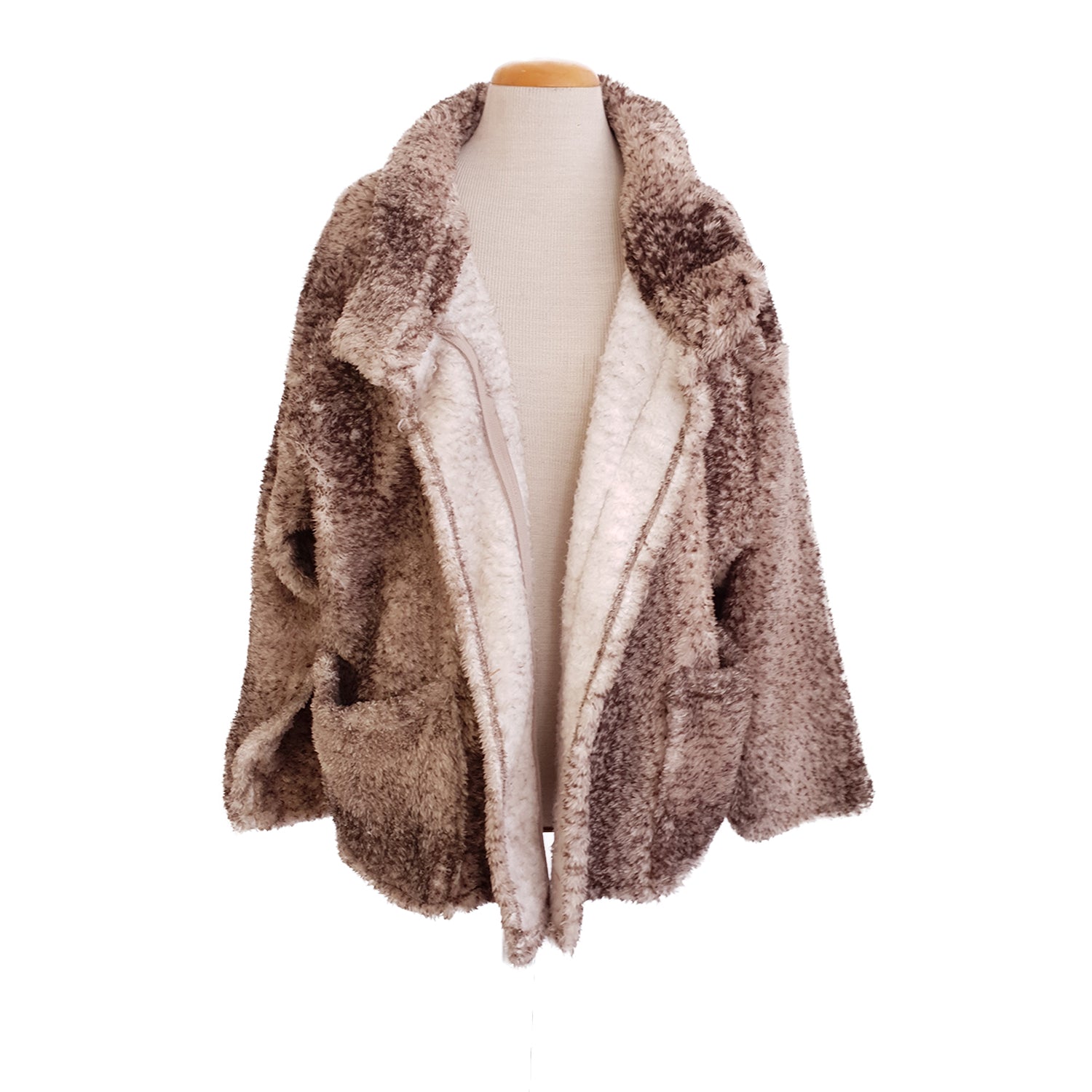 This comfy winter jacket is styled as a bomber in a fluffy animal print with patch pockets and a zip. These are lovely to relax and snuggle up in at home as well as keep warm on a chilly night.